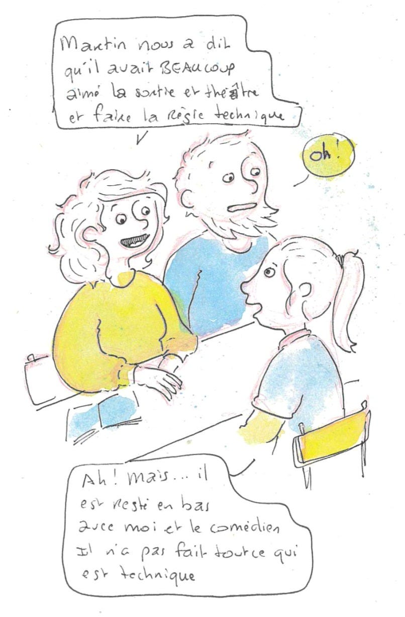 Jeudi 12 mars. Rendez-vous avec la maîtresse de Martin pour faire un point sur ses résultats, son comportement, les aides et aménagements qu’il peut avoir. Un échange globalement satisfaisant, où l’enseignante nous a aussi donné les points positifs de notre fils. ça change et ça nous a fait du bien. Par contre, quelle n’ a pas été notre surprise de découvrir que Martin n’a pas du tout participé aux effets lumières à la sortie scolaire de la semaine dernière. Il était trop agité. C’est dommage qu’il ait encore été exclu. On ne comprend pas pourquoi il nous a menti. En tous cas, il avait l’air un peu triste de ne pas avoir pu voir et tester la régie lumière et technique. Nous allons donc nous débrouiller pour qu’il puisse tester tout cela.. au théâtre ou sur une autre scène de spectacle vivant. Le pauvre, il était tellement convaincant, la semaine dernière.