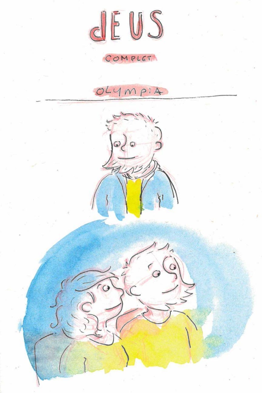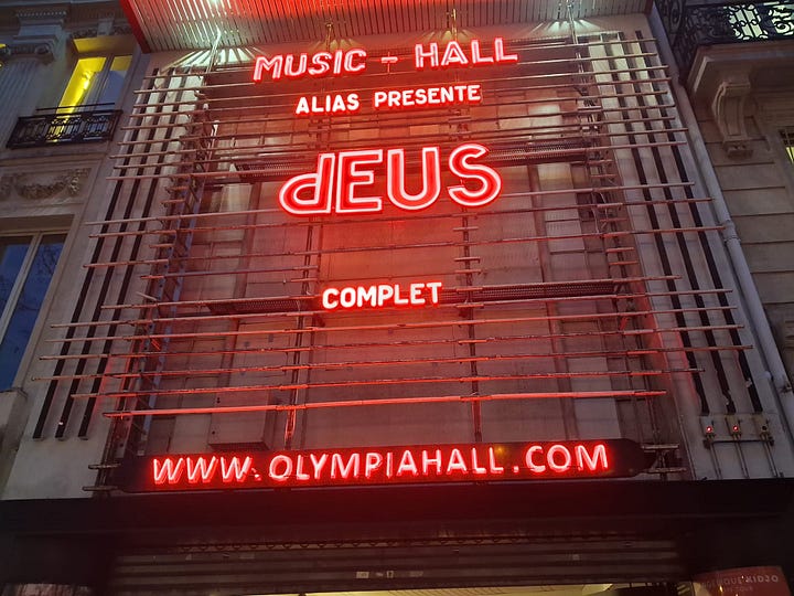 Vendredi 13 mars. Soirée en amoureux pour un concert à L’Olympia. Direction Paris en début d’après-midi. Malgré la pluie, nous nous sommes un peu promenés, avons bu un petit verre dans un café (et dégusté une assiette de frites avant le concert). Puis, nous avons profité du concert de dEUS avec ce son bien particulier, assez barré. Marc attendait ce concert depuis 30 ans. C’était son cadeau d’anniversaire. De mon côté, j’ai vraiment aimé mieux découvrir ce groupe3. Mais, ce que j’ai préféré, c’est voir Marc si heureux durant tout le concert. Ce moment à deux nous a vraiment fait du bien.