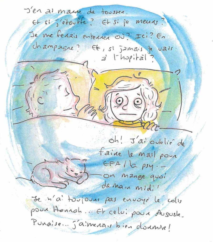 Mardi 10 mars. En ce moment, je mets vraiment du temps à m’endormir. Tout est prétexte à penser au pire : une toux nocturne1, un bruit dans le couloir, un mail oublié. Le pire étant que je sais très bien que c’est juste mon cerveau qui en fait des caisses. Rien n’est jamais aussi grave ou urgent que je le pense. Je déteste peiner à trouver le sommeil, comme ça. Ceci dit, c’est quelque chose d’assez récurrent chez moi. On prend l’habitude. 2