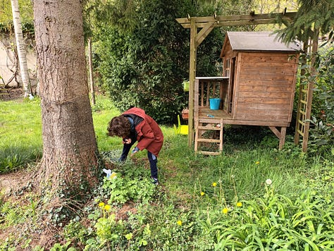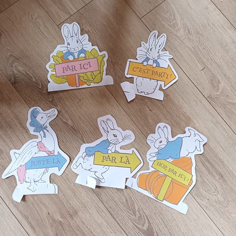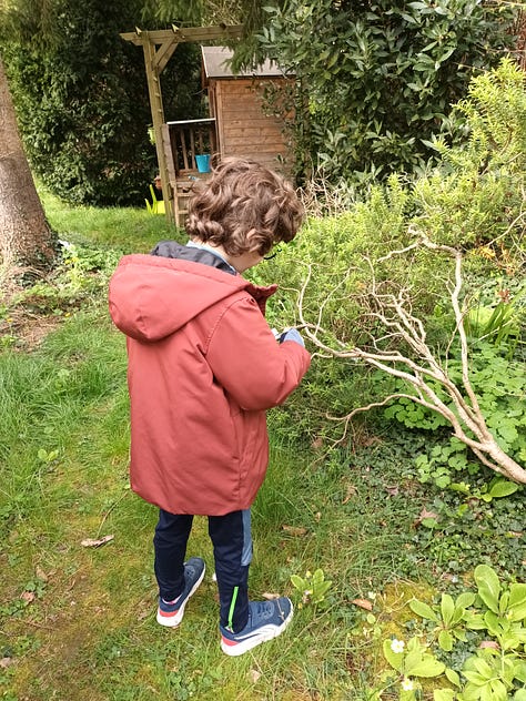 Dimanche 5 avril. Chasse aux œufs ! Martin était très impatient de découvrir ce que les cloches lui avaient apporté. Outre les chocolats, qu’il ne mange pas vraiment, il a eu des petites surprises. Nous avons eu de la chance car le soleil était au RDV en ce dimanche matin. Nous avons indiqué des cachettes des œufs (et surprises) à l’aide de petites pancartes téléchargées sur le site des éditions Gallimard Jeunesse.
