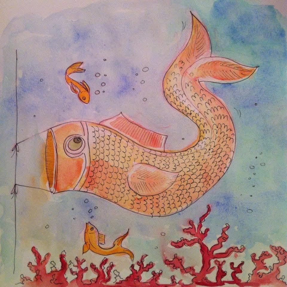 Je vous laisse donc avec ce petit dessin de poisson qui a déjà quelques années, mais que j’aime bien. C’est une carpe cerf-volant koinobori : décoration utilisée en Japon lors de la fête kodomo no hi, qui célèbre les enfants (et plus particulièrement les garçons) chaque année, le 5 mai ! Je trouve ces carpes volantes très jolies.
