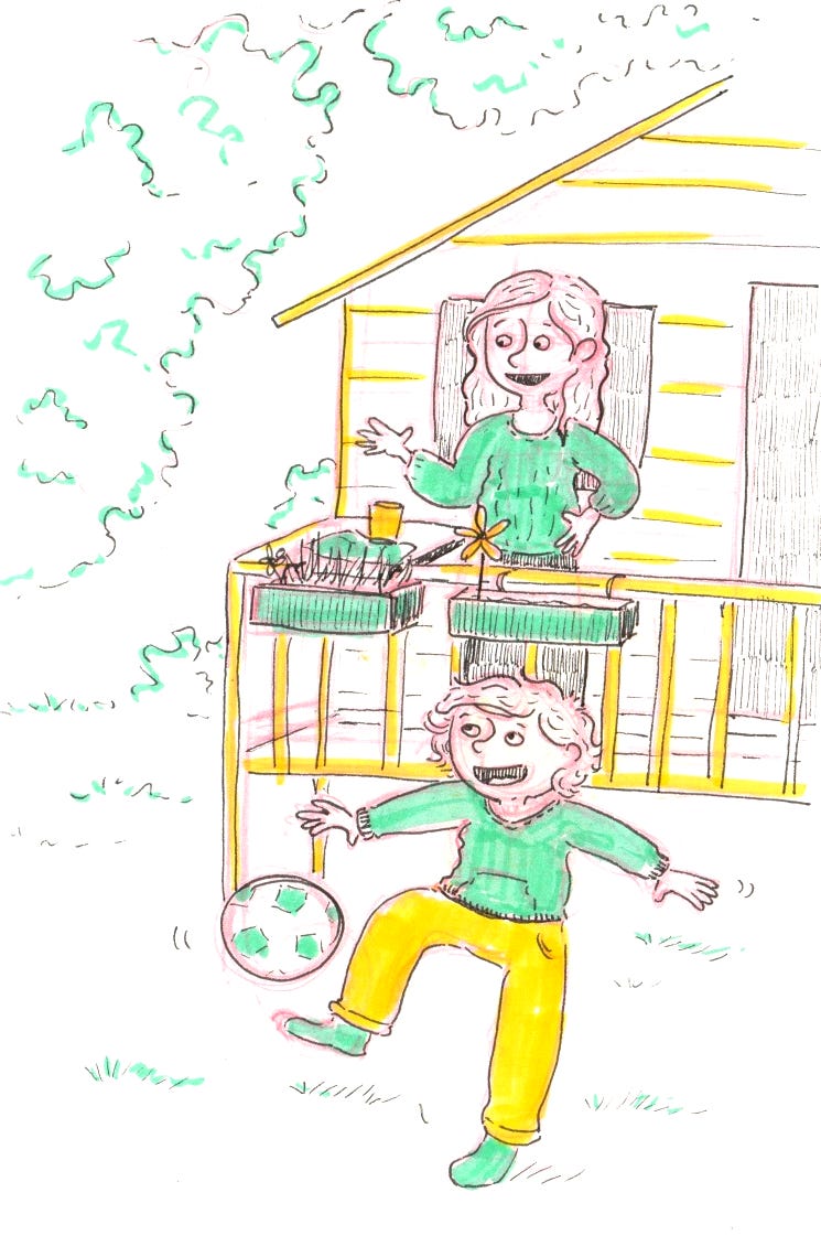 Mardi 7 avril. Après la fabrique de squichies, celle de cupackes (en pâte à modeler), celle de téléphones portables, Martin et Lila ont trouvé un nouveau concept : le restaurant- foot. Lila gère la partie restauration (elle est trop contente de jouer dans la cabane du jardin) et Martin s’occupe de proposer des entraînements de foot à ses clients et à sa collègue de restaurant. Voilà qui les a bien occupé à la sortie de l’école.