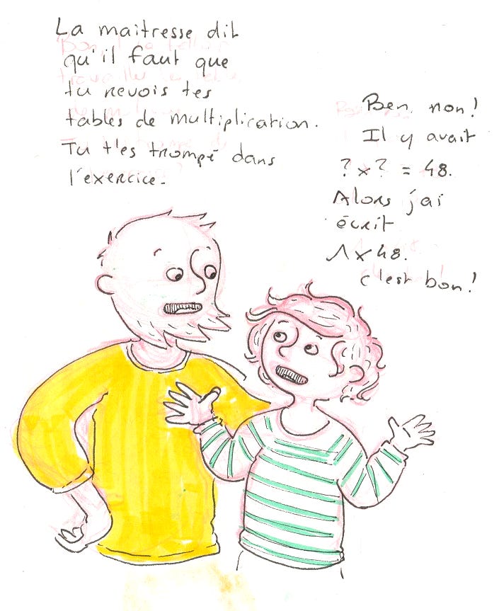 Martin a beaucoup de mal à apprendre ses tables de multiplications. Il ne les retient pas bien. On essaie de lui apprendre de manière ludique. Je ne veux pas qu’il ait autant de difficultés que moi à son âge pour apprendre ses fichues tables (j’ai beaucoup pleuré et je ne les sais toujours pas vraiment). Bref, toujours est-il que sa réponse à l’exercice donné par la maîtresse était juste…même si ce n’est pas ce qu’elle avait envie de lire. On a du lui expliquer qu’il devait donner d’autres chiffres, même si lui trouve son raisonnement complètement juste - et moins fatigant !