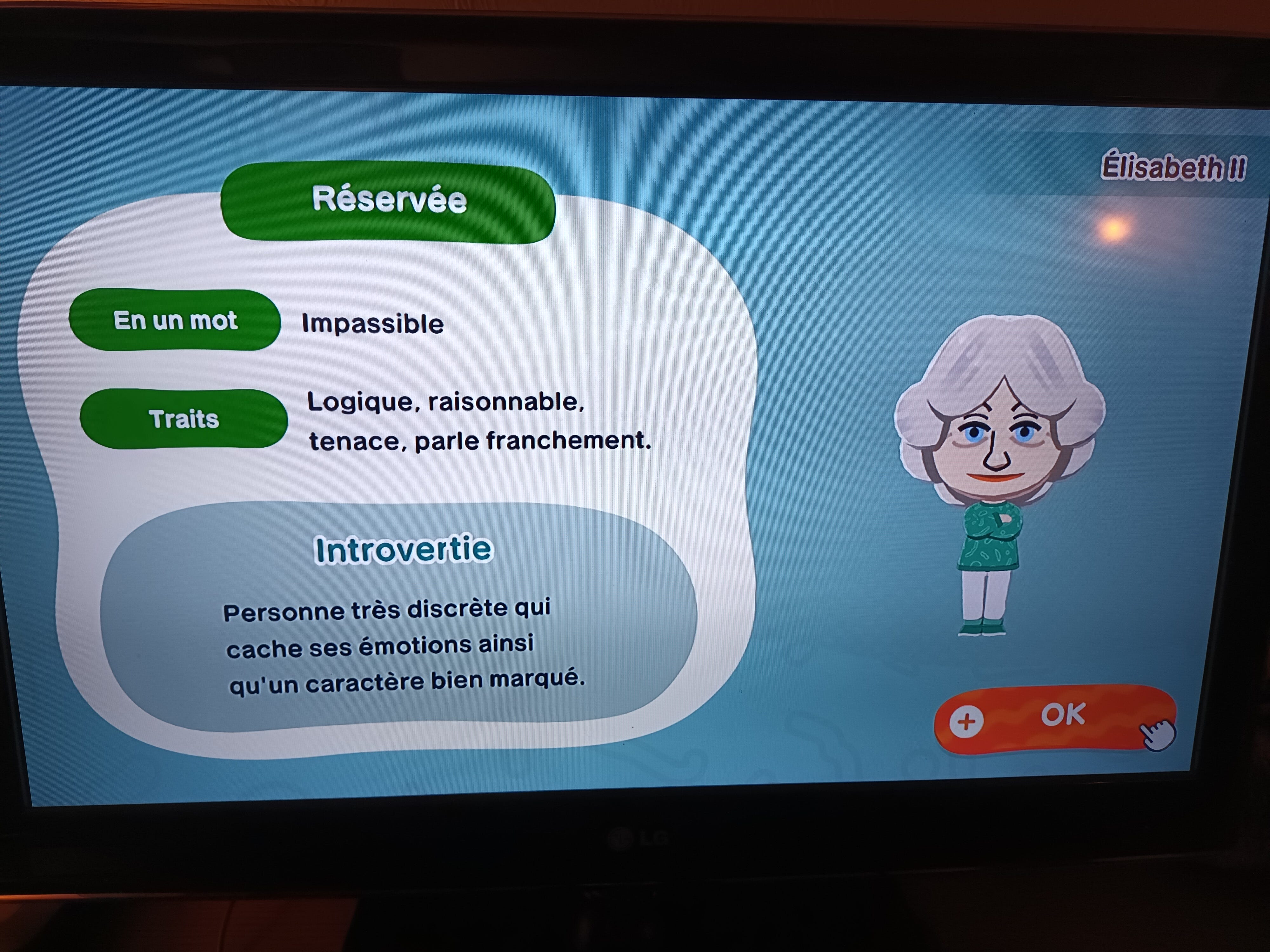 Cette semaine, nous avons reçu le jeu Tomodachi Life, sur la switch. Un jeu de simulation de vie, façon Sims où l’on peut créer ses personnages, les gérer et les faire vivre sur une île que l’on améliore au fur et à mesure du jeu. Evidemment, nous avons créé trois personnages nous représentant. Mais aussi le chanteur Gims (création Martin) , Hermione Granger, Buffy, Sheldon Cooper et la Reine Elisabeth II. Nous projetons d’ajouter Mulder et Scully, entre autre. Ce jeu est du grand n’importe quoi et est plutôt addictif. Vous connaissez ?