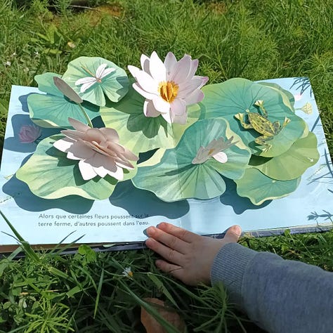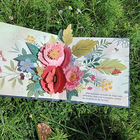 Quel magnifique pop-up autour des fleurs et de la nature. Nous avons pris beaucoup de plaisir, mon fils et moi, à découvrir les sept double pages et leurs tirettes et volets à soulever.