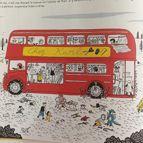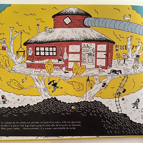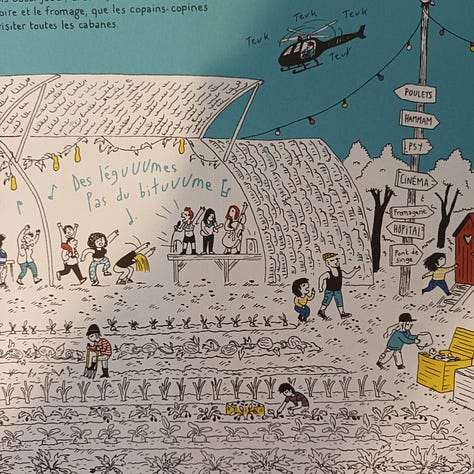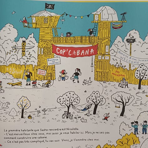 Comme j’ai aimé cet album ! C’est un bonheur de découvrir la Z.A.D de Cop’Cabana en compagnie de Sasha. On y découvre les habitants et leurs logements. L’album met en avant le partage, la simplicité et une autre façon de penser la société. De nombreuses références glissées dans les dessins montrent bien que nous sommes dans un Z.A.D. : auto-gestion alimentaire, énergétique, diversité culturelle, prix libre, débrouille et recup’. Un album qui me parle énormément et me rappelle quelques souvenirs de jeunesse.