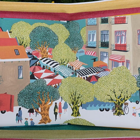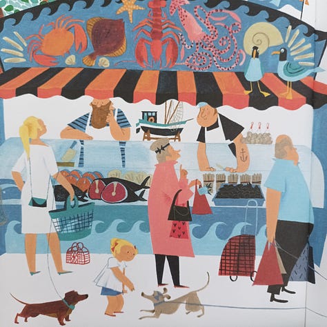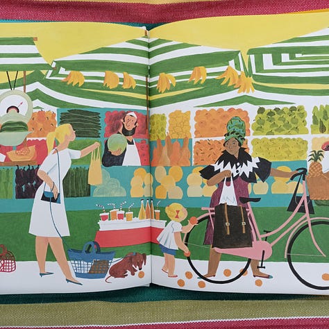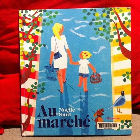 Une très jolie promenade colorée, sur le marché, en compagnie d'une petite fille, sa maman et leur chien. Quel plaisir de découvrir les étales du boulanger, du maraîcher, du fromager. La petite fille et sa maman font leurs emplettes. Leur petit chien vit ses propres aventures en parallèle : une double lecture bien trouvée.