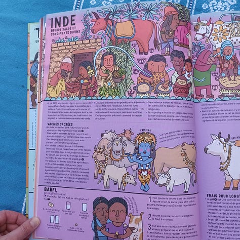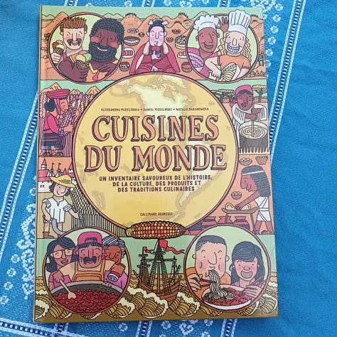 Coup de cœur pour ce documentaire très riche et détaillé emprunté dans une des médiathèques que je fréquente. Ce livre présente 26 pays différents : deux double-page pour chacun d’entre eux. On y découvre l’histoire du pays en question, sa gastronomie et une ou deux recette emblématiques. Les illustrations sont pleine de détails et chaque double page fourmille d’informations. Cela est un vrai plaisir de se plonger dans ce documentaire absolument délicieux.