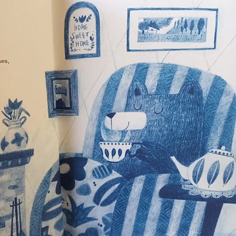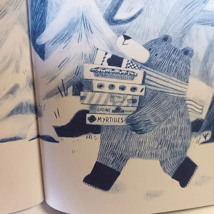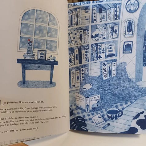 L’ours Bluet se prépare à passer un hiver tranquille, bien, au chaud dans sa maison. Il a tout prévu : livres, dessins, tisane, miel. Il écrit des lettres à ses amis. Ah ! Qu’il est doux de rester chez soi !
