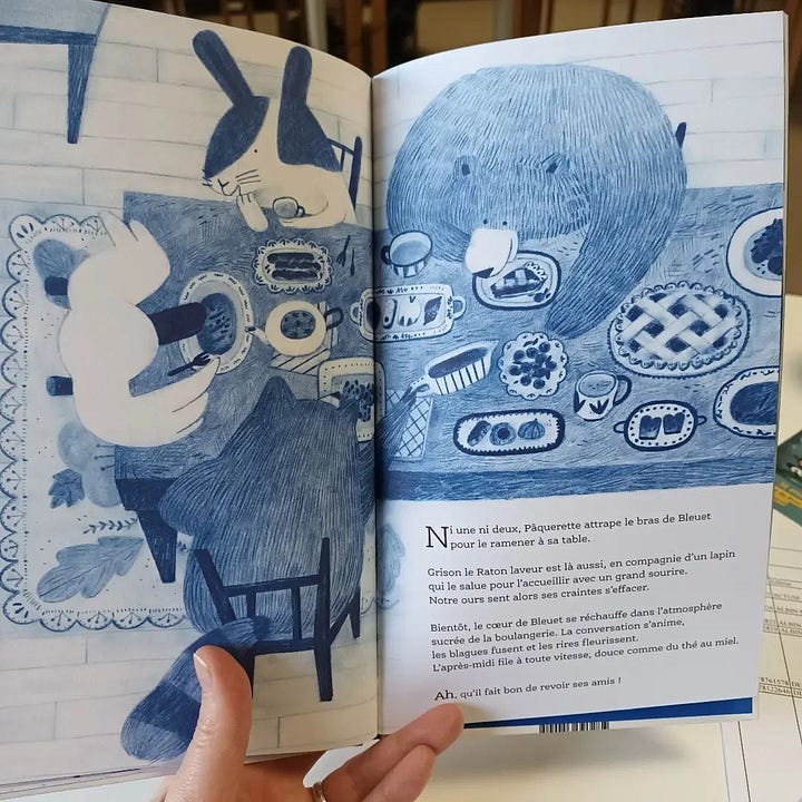 Mais un jour, catastrophe! Plus de tarte aux myrtilles. Bluet va devoir sortir de chez lui et se rendre à la boulangerie. Peut -être que s’il fait vite, on ne le verra pas et il pourra rentrer chez lui ? A moins qu’il ne passe un bon moment ?