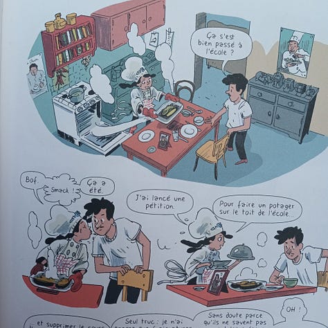 Comme j’ai aimé suivre les aventures de Yasmina. Une petite jeune fille très déterminée à faire bouger les choses. La bande dessinée est un ode à la bonne cuisine, à l’auto-suffisance, à l’écologie, à l’amour familial et, dans un sens, à la lutte contre le capitalisme (rien que ça !). Que des choses qui me parlent beaucoup. J’ai beaucoup apprécié le dessin vif et expressif de l’auteur. Il existe également une série Yasmina, en 3 volumes, mais je ne l’ai pas lue. Elle semble suivre les même thématiques que ce one-shot.