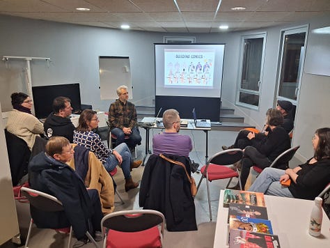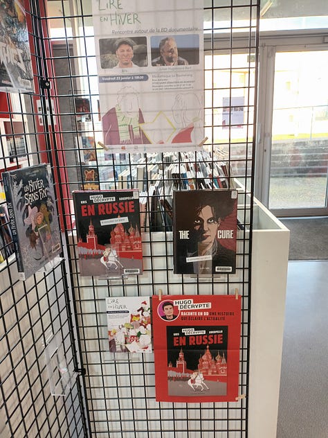 Vendredi 23 janvier. Rencontre autour de la BD documentaire. Avec Kris (Hugo Décrypte la Russie, Allary, 2025), scénariste BD adepte des récits historiques inspirés de faits réels et Julien Hugonnard-Bert (The Cure en BD, Petit à Petit, 2025) dessinateur spécialisé dans l’encrage des comics. Les deux auteurs nous ont parlé de leur métier, leur façon de travailler et les enjeux autour de le BD documentaire. C’était une soirée vraiment intéressante et riche... malgré le peu d’inscrits. (sept!)