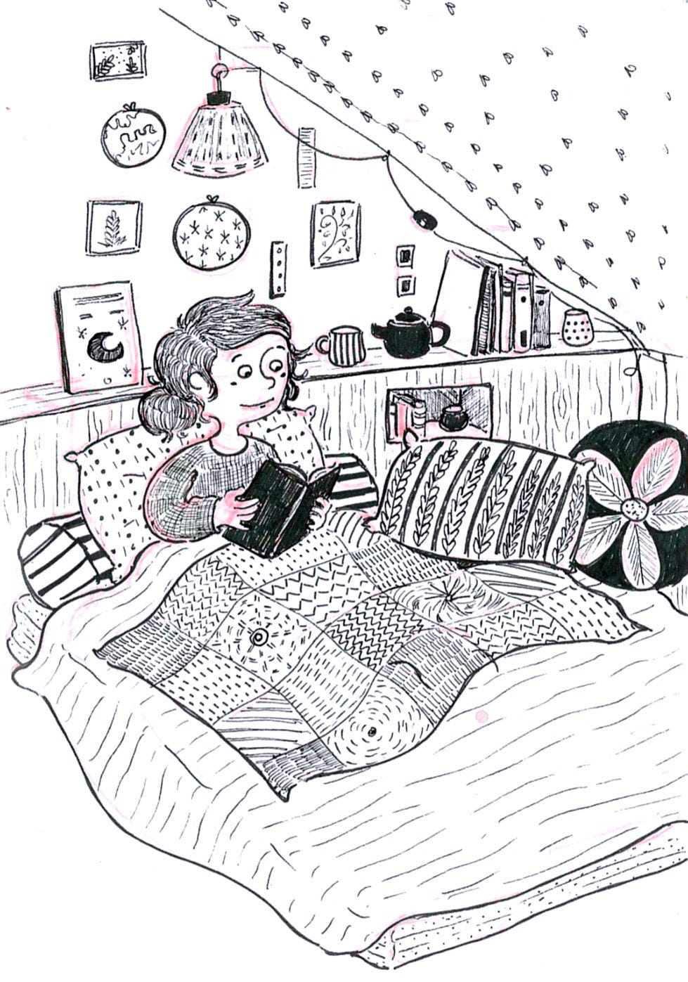 Dessin de la semaine avec mes sujets favoris : des livres, des couvertures et encore des livres. Un dessin en monochrome : sujet du mois proposé par Teresa Barroso dans son slow mail club. Le thème de février sera “carte postale / carte de voyage” (Traveling Card). Je me suis beaucoup amusée à dessiner mon coin lecture... même si je trouve que j’aurais pu ajouter plus de détails. J’aurais aussi pu utiliser un stylo blanc pour faire des ajouts sur les aplats de noir. Et, j’ai été assez frustrée de ne pas retrouver mon stylo pinceau pour faire beaucoup plus facilement des fonds en noir. Encore un objet qui a mystérieusement disparu !