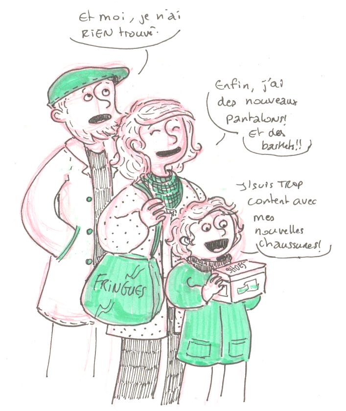 Samedi 31 janvier. Après-midi shopping. J’ai enfin trouvé des pantalons qui ne me serrent pas les jambes (essentiel à cause de mes douleurs aux dites jambes) et une paire de baskets simples. En plus, on ne savait pas que c’était encore les soldes. Voilà, la corvée achat de vêtements est terminée pour cet hiver1.