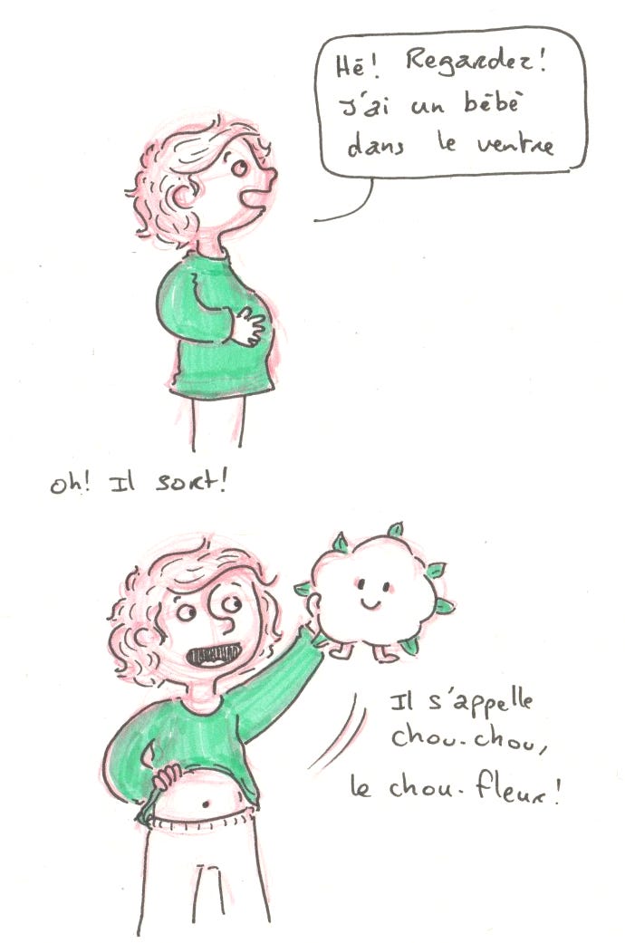 Dimanche 1er février. Le jeu du jour pour Martin. Il a donc eu un bébé chou-fleur, un bébé carotte et un bébé ballon. Je pense que c’est le bon moment pour lui ré-expliquer comment on fait les bébés.