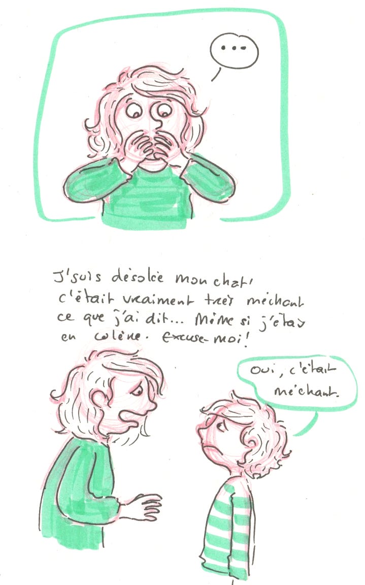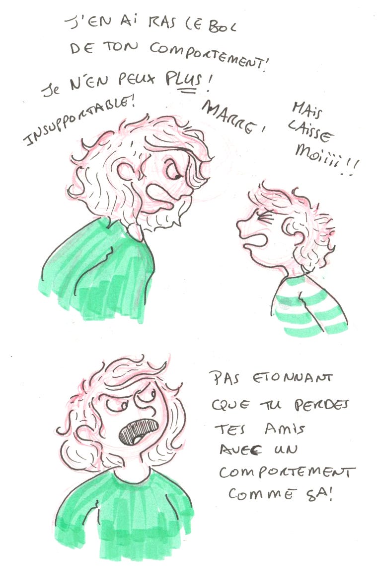 Je voulais aussi te dire que je pense fort à toi, à Marc et à Martin. Ce que vous vivez avec l'exclusion et la solitude de Martin à l'école, c'est vraiment difficile. Et ce moment de mercredi où tu as craqué... tu sais, tu n'es pas une "mère horrible". Tu es une maman qui traverse quelque chose de lourd, qui fait de son mieux chaque jour, et qui s'en veut quand elle atteint ses limites. Ça te rend humaine, pas horrible.