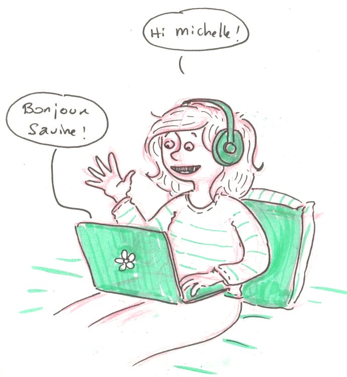Vendredi 30 janvier. Ce soir, conversation en visio avec Michelle. Une illustratrice américaine dont je suis le Substack. Nous avons décidé de discuter ensemble afin qu’elle travaille son français et moi, mon anglais. C’était très chouette de parler ensemble. On a déjà prévu de faire une nouvelle discussion. Merci Michelle.
