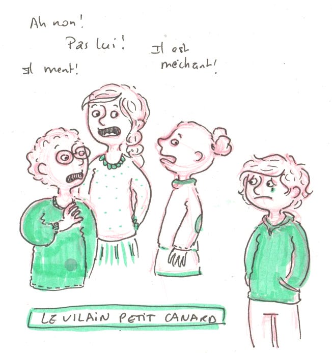 Mardi 27 janvier. Aujourd’hui, nos cœurs de parents se sont serrés en apprenant que notre fils était encore une fois exclu. Il est de moins en moins invité aux fêtes des autres enfants. Ces derniers le délaissent aussi à la récréation. On sait bien que notre fiston a des soucis de comportements… mais cela nous brise le cœur de le voir de plus en plus seul. On aimerait tellement que les autres voient aussi tout ce qu’il y a de beau en lui. Même si son comportement est vraiment compliqué en ce moment. Bref, on a l’impression qu’il est devenu le vilain petit canard de l’école. Mais, comme dit Marc, on sait comment se termine l’histoire.