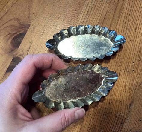 Jeudi 5 février. Petit tour à la Croix-Rouge d’Evreux afin de trouver des déguisements pour Martin (mission accomplie). J’ai également déniché des mini-moules à tarte. Maman utilisait ce genre de moules pour faire des tartelettes avec les restes de pâte à tarte2. ça permettait de ne pas gaspiller et de nous faire des super goûters. Bref, j’ai eu une grosse séquence nostalgie en voyant ces petits moules : je les ai donc ramené à la maison. A mon tour maintenant de perpétuer la tradition.