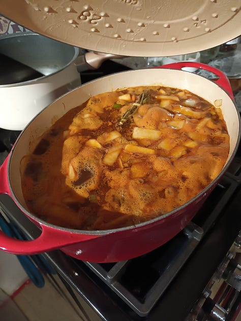 Samedi 7 février. Marc a préparé un excellent Irish Stew pour dimanche. Nous recevons des amis. Il a pris la recette dans le livre Irlande - Les meilleures recettes d’un pays chaleureux et authentique que nous avons acheté en octobre denier. Le livre est tellement beau et les recettes font toutes envie. Le chef Jospeh Doverman, qui a écrit ce livre, est irlandais et vit maintenant en France. Il partage ses recettes et surtout les souvenirs qui vont avec. Voilà ce qui résume bien notre idée de la cuisine : partage, souvenirs et transmission. Le Irish Stew préparé par Marc était absolument fabuleux ! De mon côté, j’ai préparé mon gâteau aux pommes préféré.