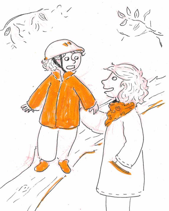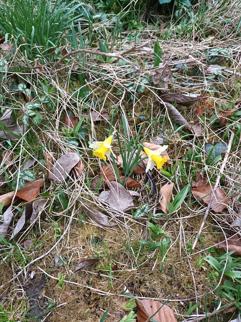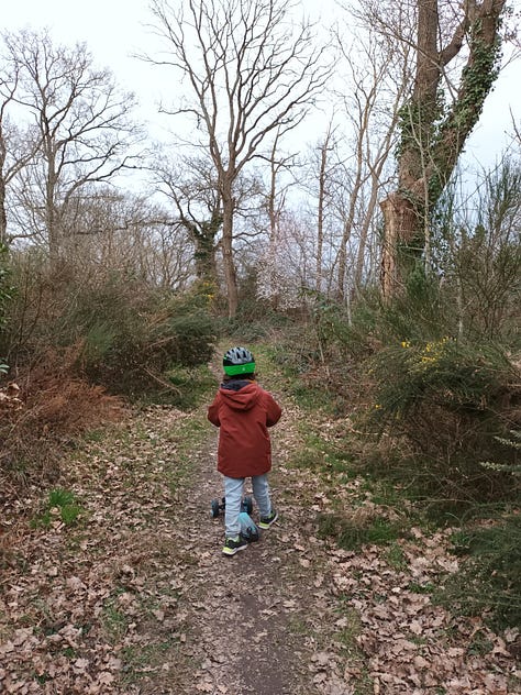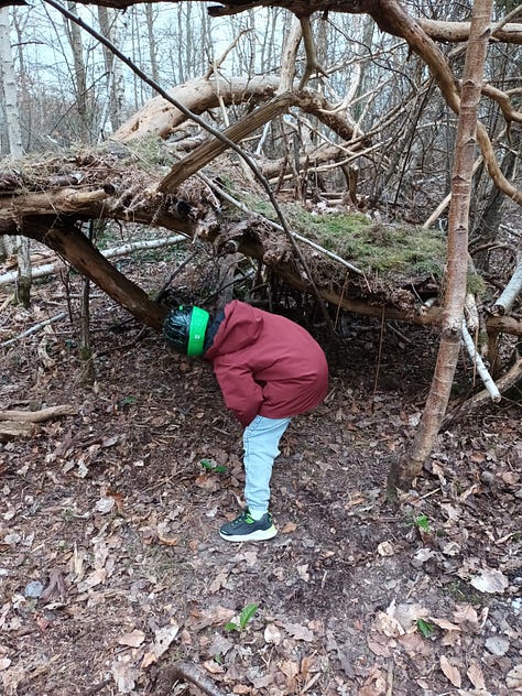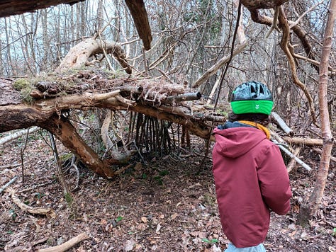 Dimanche. Promenade en forêt (derrière chez nous). Nous y avons trouvé une mystérieuse cabane. Quel plaisir de marcher dans les bois et de voir les premières fleurs pointer leurs nez. Ah oui, et c’est super aussi de faire les aventuriers en marcha,t sur un l’arbre tombé au sol, qui a servi de support à la cabane mystère.