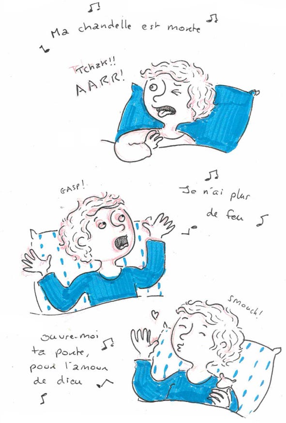 Mercredi. Chaque soir, après la lecture d’histoire, nous chantons “Au clair de la lune” à Martin, avant de lui faire le “bisous-bonne-nuit.” En ce moment, il s’amuse à mimer chaque paroles. Avec des mimiques dignes du mime Marceau. ça nous fait tellement rire ! Un vrai show man, notre lutin !