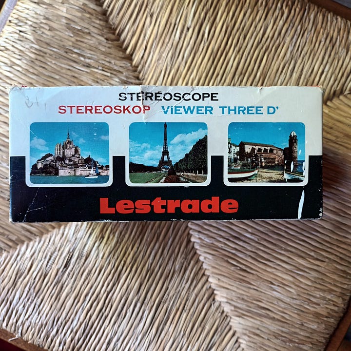 Samedi. Petit tour au magasin “Le vide Grenier”. On aime bien essayer de trouver des choses insolites. Et là, au détour d’un rayon, Martin a trouvé un Stéréoscope ! Marc et moi nous sommes pris une vague de nostalgie ! Retour en enfance immédiat. Mon grand-père maternel avait un appareil comme cela et j’aimais beaucoup jouer avec. Nous avons donc craqué et acheté cette visionneuse et ses deux planches. Maintenant, nous sommes à la recherche de nouvelles planches.