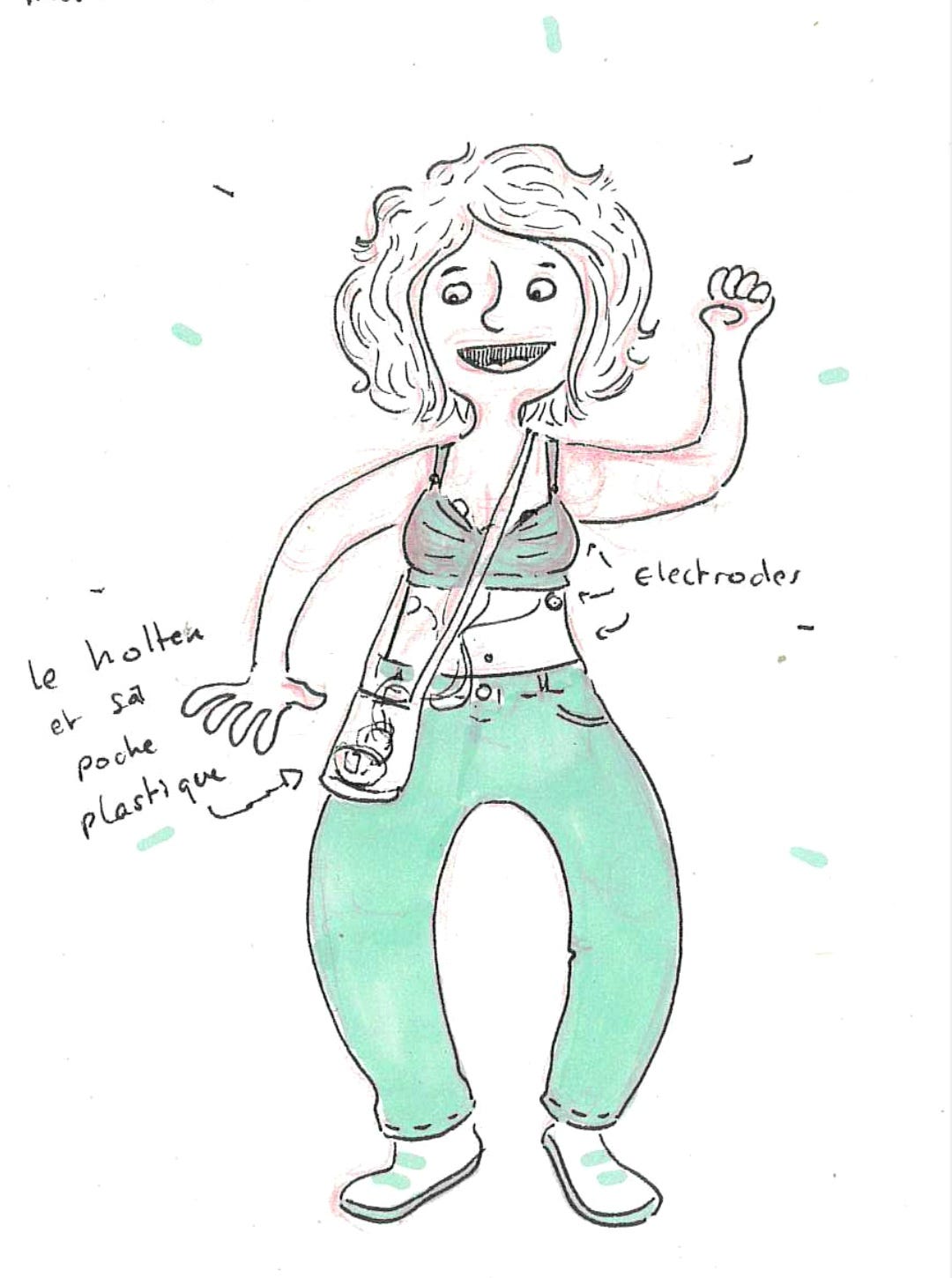 C’est marrant, parce que j’ai bien vu l’évolution de ces petits enregistreurs depuis les années 90. Avant, c’était des sacoches assez grosses, façon walkman et pas du tout discrètes. J’ai quelques souvenirs de collège à me balader avec mon holter en bandoulière. C’était “lourd”. Là, c’est plus léger, un peu plus moins visible aussi. Par contre, les pastilles autocollantes me laissent toujours autant de marques rouges sur le corps après le retrait de l’appareil.