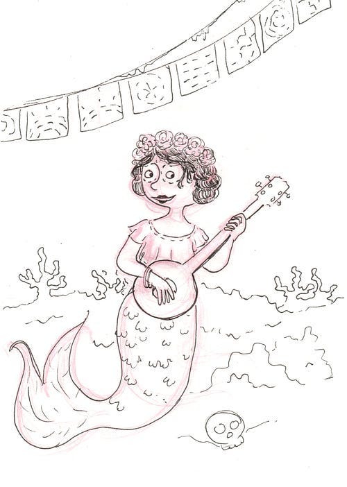 La semaine dernière, j’ai commence le challenge Mermay (voir la newsletter de la semaine 18). Je me suis bien amusée avec cette petite sirène mexicaine. Je la mettrais certainement en couleurs quand j’aurais terminé les illustrations pour le guide bus.