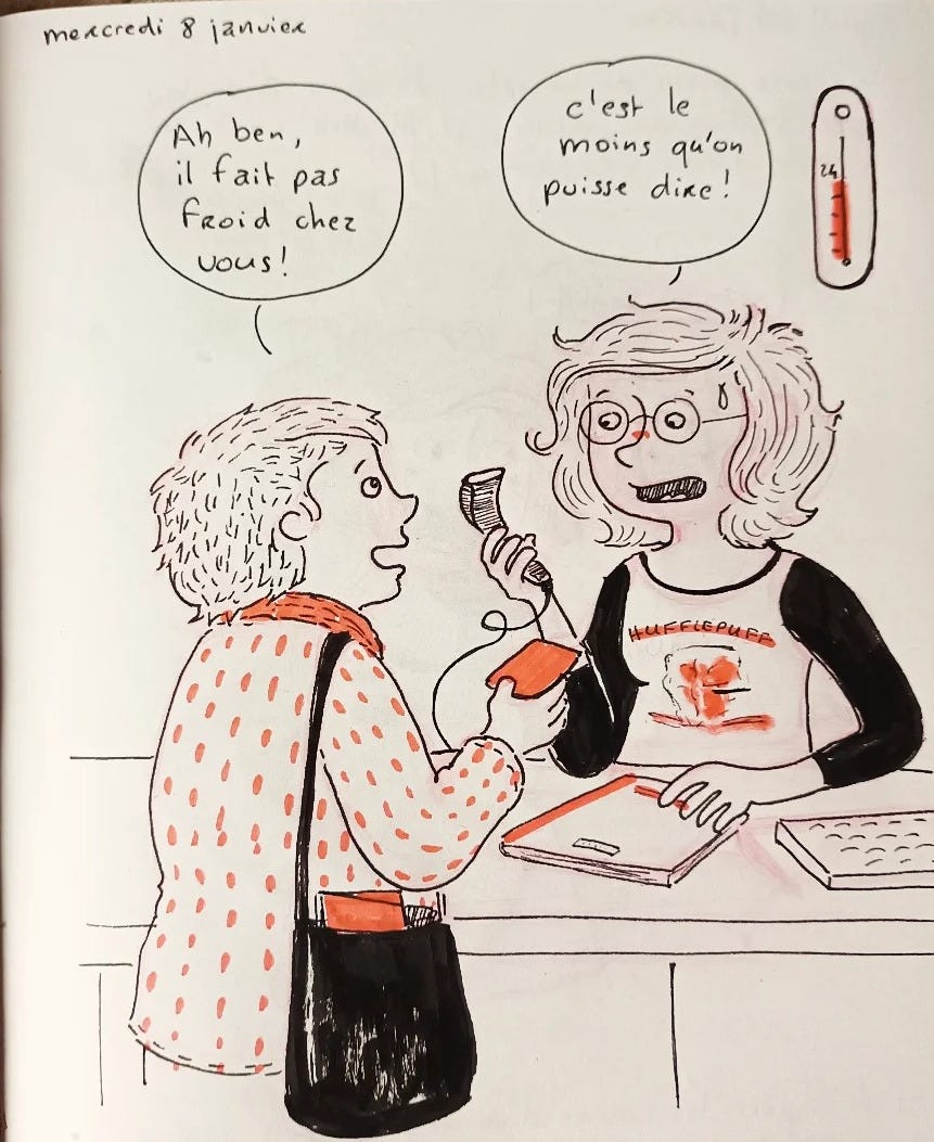 Le chauffage est cassé à la médiathèque. La semaine dernière il faisait 13 degrés, ce mercredi c'est monté à 25 !