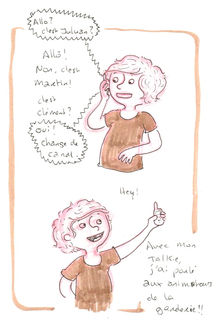 Jeudi. La grosse rigolade du soir. A la garderie, après l’école, les animateurs utilisent des talkies-walkies pour se parler entre eux. Le meilleur copain de Martin a réussi à trouver le canal sur lequel communiquent les animateurs. Ni une, ni deux, notre lutin a testé en rentrant à la maison. Ses petits appareils ont une bonne portée. Même si nous habitons vraiment pas loin de l’école. Bref, ça a fait la soirée de notre fiston. Trop content de faire une blague à animateurs. Il nous en a parlé pendant 2 jours.