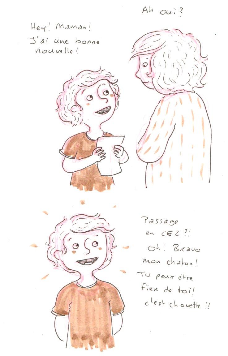 Mardi. Oh ! comme il était fier de nous montrer son papier de passage en CE2. Il a gardé la surprise jusqu’au repas de midi. Bon, nous n’avions pas trop de doute sur le fait qu’il passe en CE2 l’an prochain. Mais c’était tellement mignon de le voir heureux comme tout. Même s’il est très content de passer au niveau supérieur, il a peur de devoir changer de maîtresse. Il aime beaucoup son enseignante actuelle, et c’est réciproque, elle l’encourage énormément. Affaire à suivre, mais je crois bien qu’il va rester avec sa maîtresse.