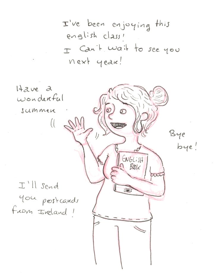 Jeudi : Dernier cours d’anglais de l’année. Je suis super contente de mon année. Je pense que j’ai bien progressé au niveau de la grammaire. Ma prof est géniale et mon groupe aussi. J’ai donc décidé de continuer l’année prochaine. Là, j’ai un niveau B1+ et j’aimerais bien arriver au B2. Je n’ai pas vraiment de problèmes de vocabulaire ni de compréhension en général, c’est plutôt pour m’exprimer que c’est plus difficile. J’espère que je réussirais à me débrouiller lors de notre voyage en Irlande. Et j’espère aussi que je n’ai pas fait de fautes sur mes phrases, dans mon dessin. Let me know !