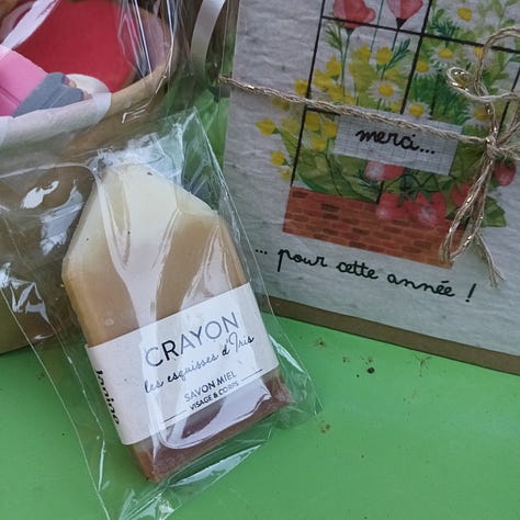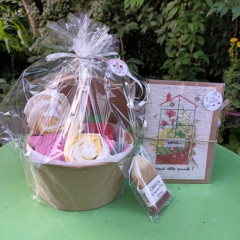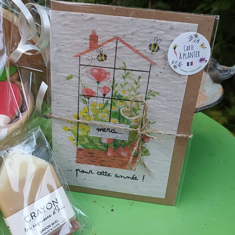 Nous avons acheté une petite boite de sablés et meringues faits par une personne de la commune. Ce sont Les p’tits Christuits. Il sont délicieux (ça n’est pas la première fois qu’on commande). Et, nous avons complété avec une carte à planter et un savon artisanal dénichés dans la boutiques Les cartes de Lulu. Je trouve que c’est super mignon, pas vous ?