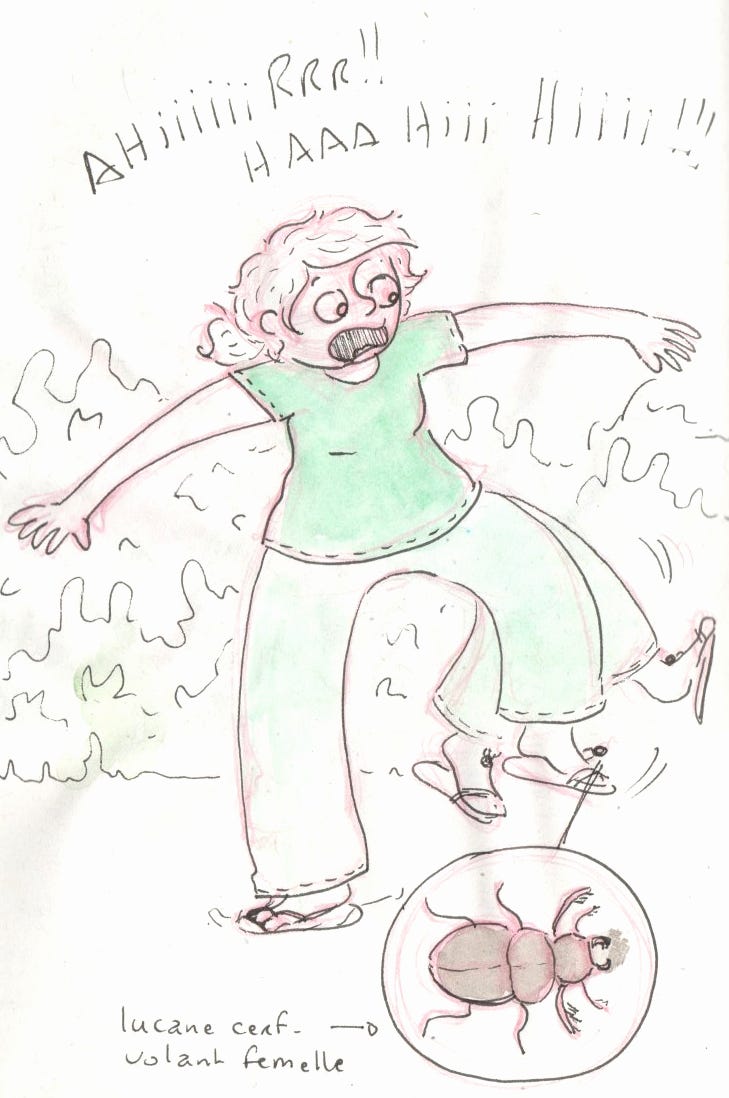 jeudi.Crise de panique en prenant l’apéro dans le jardin, ce jeudi soir. J’ai été attaquée par une grosse bestiole. J’ai cru à une espèce de frelon. ça me pinçait à la cheville. J’ai hurlée (fort, longtemps) et ai secoué frénétiquement la jambe jusqu’à dégager l’intrus. Il s’agissait en fait d’une lucane cerf-volant femelle2, tout à fait inoffensive, mais très impressionnante. En tous cas, c’est une bestiole qui s’accroche !