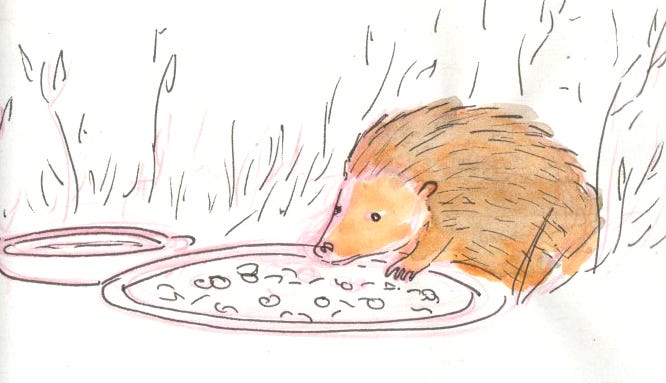 Vendredi. Marc a découvert un petit hérisson dans notre jardin ! C’était trop mignon. Nous en avons déjà eu et c’est toujours un bonheur de s’apercevoir que les hérissons reviennent. Nous lui avons mis quelques coquettes pour chats et de l’eau. Et, nous l’avons surnommé Kenji.