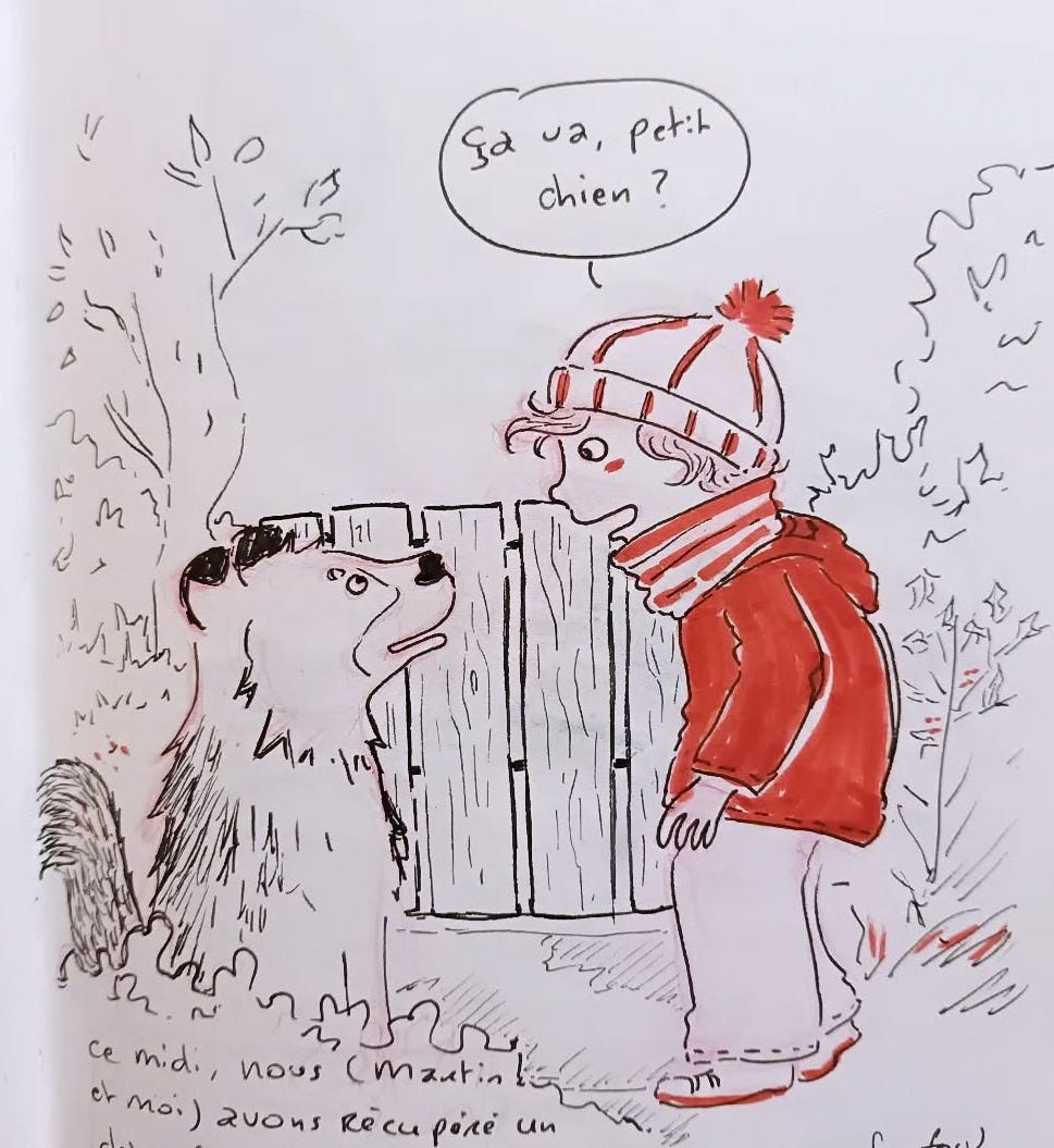 Lundi, on a recueilli un chien perdu. Moi qui ne suis pas à l'aise avec les chiens, je n'ai même pas eu peur. Il était très gentil. Et il a retrouvé ses maîtres.