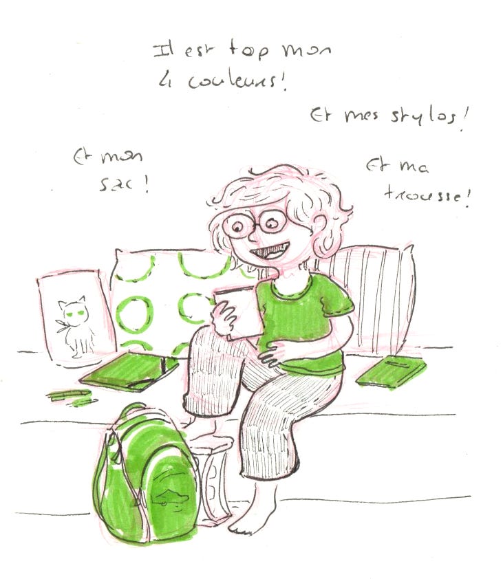 Le voilà paré pour son entrée en CE2. Il garde la même maîtresse et ça le rassure pas mal. Eh oui, toujours une petite anxiété avant de reprendre le chemin de l’école. Je peux vous dire que tout s’est passé à merveille et qu’il a beaucoup aimé sa journée de reprise.