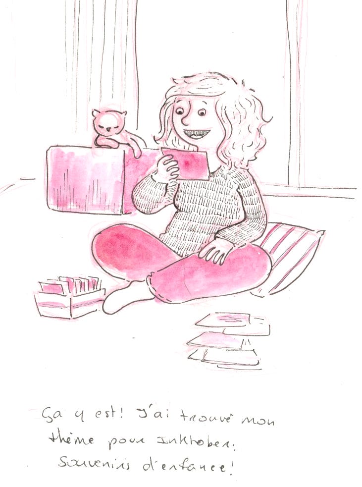 Lundi 22 septembre. Octobre approche et avec lui le retour de Inktober ! Je ne sais pas si vous connaissez. Inktober est un challenge qui se déroule en octobre. Le but est de faire un dessin par jour en suivant une liste pré-définie (ou bien en faisant sa propre liste). J’aime beaucoup participer à ce défi et le faire à ma sauce. Cette année, j’ai pris comme thème “Mes souvenirs d’enfance”. Je ne sais pas du tout si je réussirais dessiner chaque jour en continuant le journal dessiné en parallèle. A voir donc. Je partagerais mes dessins sur mon substack, bien évidement ! E vous, vous participez ?