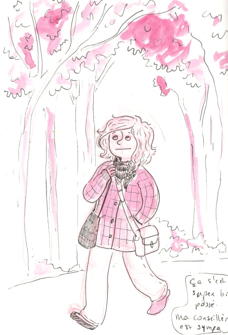 Jeudi 26 septembre. Aujourd’hui, c’est mon premier RDV pour mon bilan de compétences. J’avoue que j’étais un peu stressée de commencer. J’espère que le bilan sera bénéfique et qu’il m’apportera des réponses. En tous cas, ma conseillère est sympa et m’a tout de suite mise à l’aise. Sinon, le bâtiment où j’effectue le bilan est une construction des années 80, façon vaisseau spatial, entouré d’arbres. C’est un endroit déroutant et agréable à la fois.