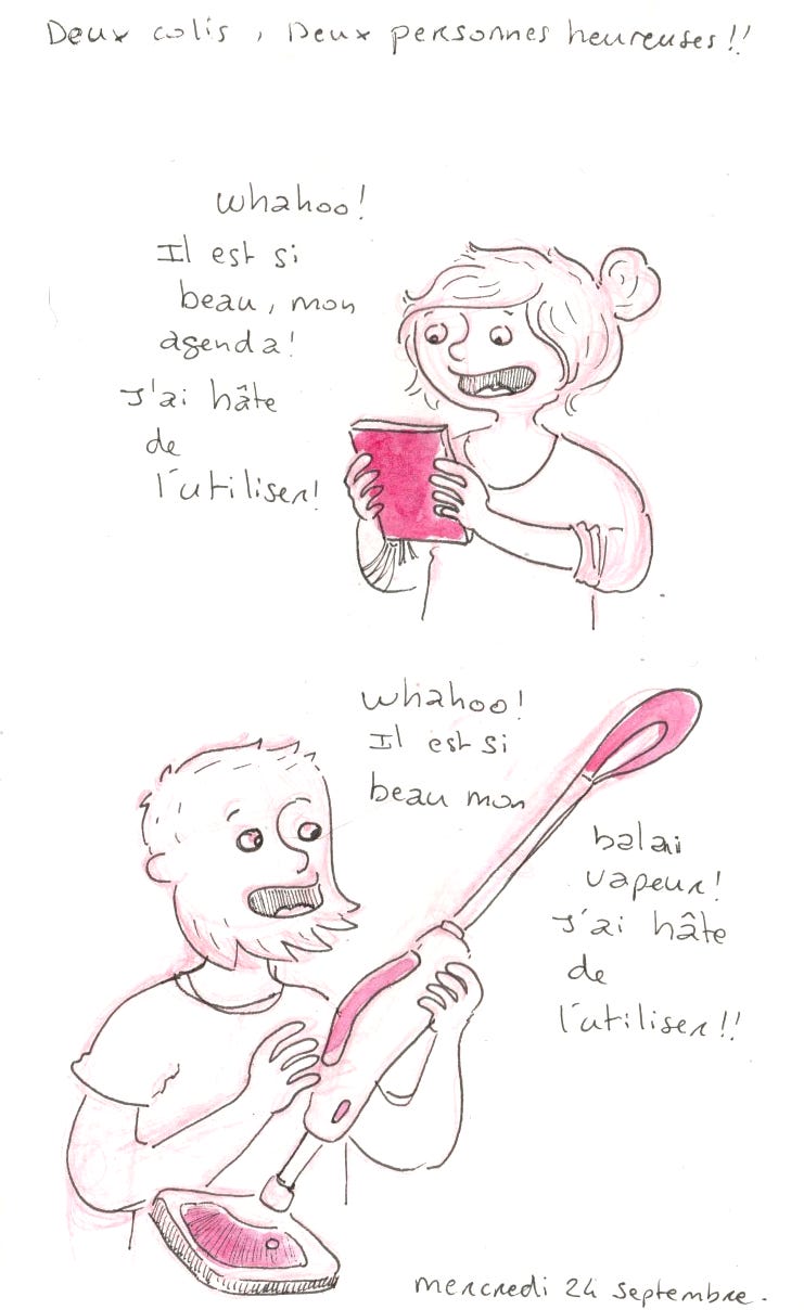 Mercredi 24 septembre. J’ai reçu mon tout nouvel agenda de chez My365. Il est tout beau et bien fonctionnel. D’habitude, je fais les pages de mon agenda moi-même. Mais avec tous les RDV qui se profilent à l’horizon, j’ai opté pour la version toute faite. Le même jour, Marc a reçu le balai à vapeur qu’il avait commandé. On était contents tous les deux avec nos colis.