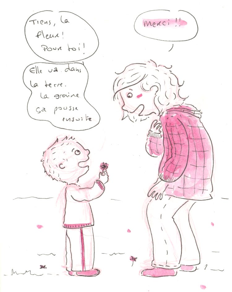 Dimanche 28 septembre. Ce week-end, les parents de Marc sont venus nous rendre visite. Dimanche, nous sommes allés faire un petit tour au parc à côté de chez nous. Un petit garçon (d’environ 3 ans) est venu vers nous et a offert des fleurs à la maman de Marc, puis à moi et enfin à tout le petit groupe. C’était adorable. J’aime tellement la spontanéité des enfants. Tout parait si simple, pour eux.