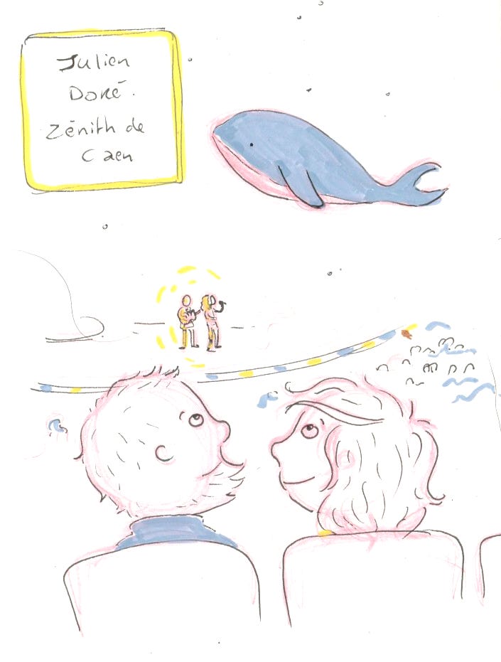 Vendredi 24 octobre. Ce soir, nous sommes allés au concert de Julien Doré au Zénith de Caen. C’était un show de folie où tout était bien orchestré et millimétré. Du bon son, des vidéos, des effets pyrotechniques et … une baleine géante qui a navigué au dessus du public. Même si nous préférons les petites salles, nous avons vraiment aimé ce concert. C’est génial de pouvoir repartir en concert et spectacle3.