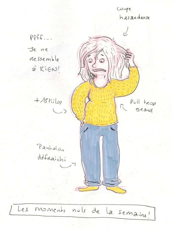 Je n’aime tellement pas l’image que je renvois de moi, en ce moment. Trop de kilos, une coupe de cheveux aléatoire, des vêtements informes et qui me donnent une silhouette trapue. Bref, il est grand temps que je me reprenne en main. Le plus dur va être de trouver de nouveaux vêtements. Je déteste faire du shopping et je ne sais jamais quelle style choisir. Je regrette l’époque où je mettais du 34 et je pouvais absolument tout mettre. Snif !