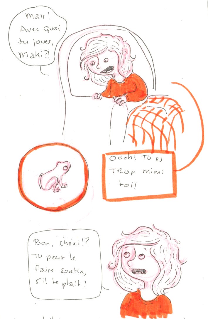 Vendredi 7 novembre. ce soir, un bébé crapaud est venu nous rendre visite dans le salon. Il était si minuscule ! ça n’est pas la première fois qu’un crapaud rentre dans la maison, ceci dit. Bref, entre les hérissons, les souris, les oiseaux, les orvets et autres petites bêtes, c’est un peu l’Arche de Noé, chez nous.
