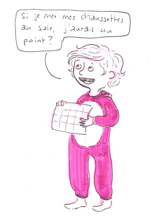Mardi 2 décembre. L’éducatrice spécialisée qui suit Martin nous a proposé de faire un tableau de réussite. L’idée est de renforcer les actions positives (et seulement celles-ci). Chaque réussite apporte un nombre de points. Au bout d’un certain nombre de points, l’enfant obtient une petite récompense : Un moment privilégié, un petit objet, etc. Martin essaie donc de tirer profit du système. Une petite mise au point a été nécessaire. N’empêche, ça a l’air de le motiver pour mieux écouter. Affaire à suivre.