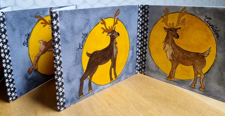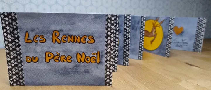 En cette période de festivité, j’ai participé au Merry ZineMass Challenge organisé par Hippo fait des trucs. L’idée était de confectionner un mini zine sur le thème de Noël afin de l’envoyer à une personne participant au challenge. L’adresse nous était donnée par Hippo. J’ai donc reçu le superbe mini-zine de Ijine. J’ai adoré découvrir tous les rennes du Père Noël prendre vie sous ses pinceaux. Elle vous explique son pas à pas sur son substack. Merci encore ! J’adore ton mini zine. Il va officiellement faire parti de notre déco de Noël.