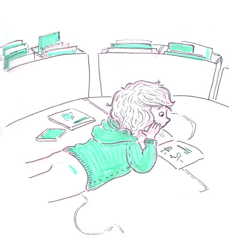Mardi. Martin préfère rester lire à la médiathèque (pendant que je travaille) plutôt que de rentrer se reposer à la maison, après le centre de loisirs. J’adore le voir lire si concentré et calme. Il aime particulièrement les documentaires et nous en parler ensuite.