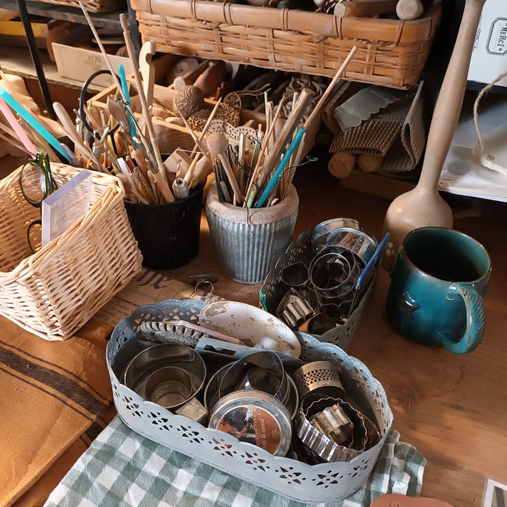 L’endroit est magnifique : une atelier tout en pierres et en bois, un joyeux bric à brac de créations, un poêle à bois, une véranda, des trouvailles ci et là. Une jolie roulotte aménagée avec un déco colorée pour prendre un petit goûter. Et, s’amuser avec la terre, jouer avec les emporte-pièces, les pochoirs, la peinture. Voir se réaliser sous mes mains des créations que j’avais imaginé dans ma tête. Et puis, Carole est vraiment adorable, elle aide, guide; toujours avec le sourire et beaucoup de bienveillance. J’ai vraiment aimé son accueil très chaleureux. Je sais déjà que je retournerais faire un autre atelier dans l’année.