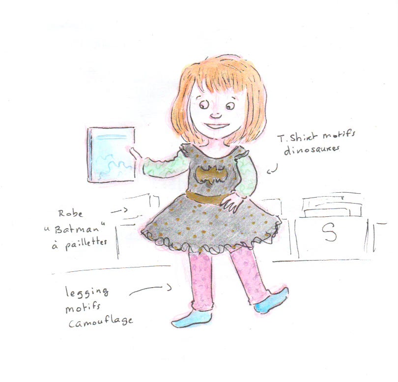 J'aime trop la petite fille aux habits colorés ! On fait vite perdre l'habitude aux petits de s'habiller selon leur imagination, et les habits pour adultes sont assez ternes, je trouve ça très triste ! J'attends une commande de Princesse awesome & boy wonder, qui fait des habits non genrés et pour adultes et qui célèbrent la science et l'imagination. J'ai trop hâte de recevoir ma robe avec des dinos arc-en-ciel, l'autre avec des oiseaux en origami, et mon t shirt à motif synapses !